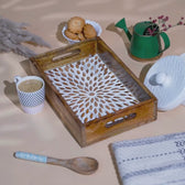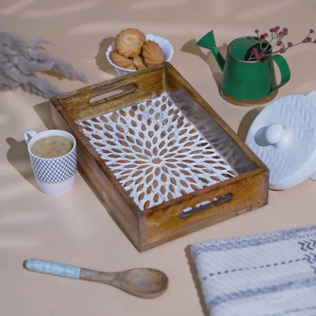 Design: Our wooden serving tray in brown comes in square shaped design which is complemented with the use of filigree motifs on the surface of the tray. This wooden serving tray has been made by hand, adding to its overall uniqueness.